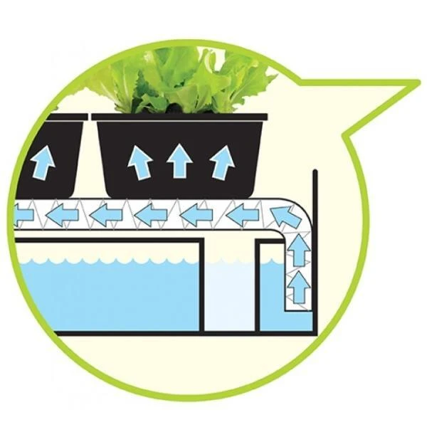 Dankzij de capillaire werking van het vloeidoek krijgen kweekbakken en potplanten, die bovenop de schaal staan, automatisch water gedurende ca. 14 dagen.
