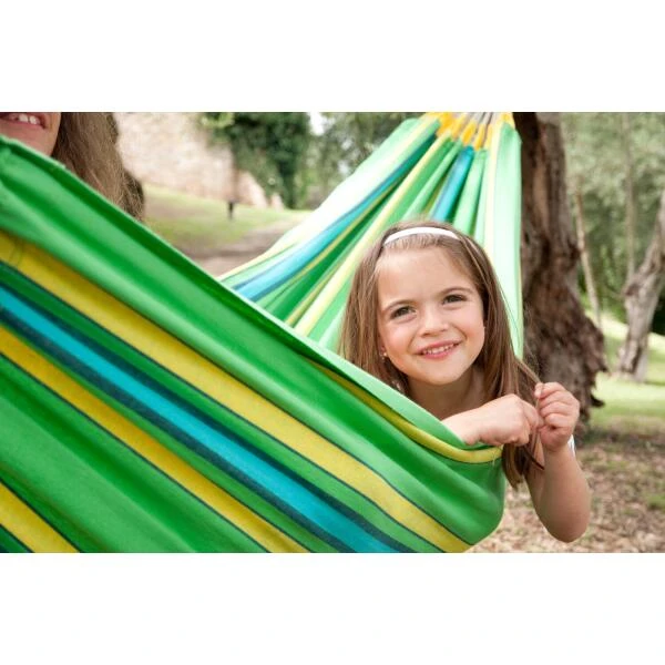 De Currambera hangmat van La Siesta is een klassieke tweepersoonshangmat uit hoogwaardig katoen. De stof heeft stralende kleuren en is extra zacht.